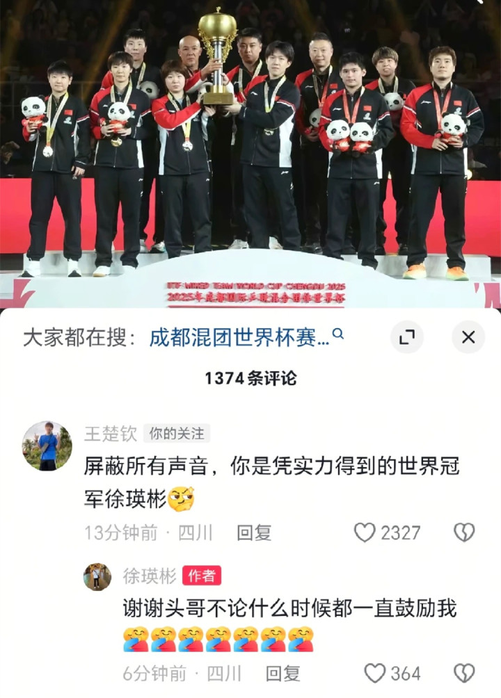 夺冠后,徐瑛彬在冒昧媒体上发文转头比赛,写谈:“成皆之旅圆满限定,通过我方的勉力站上了寰宇顶级的舞台,也向公共展现了我方,通过此次的经历看到了我方的差距和不及,面对这么的赛场我方还远远差的许多。”在这条动态下,王楚钦留住了严容庄容的驳倒:“屏蔽整个声息,你是凭实力得到的寰宇冠军徐瑛彬!”徐瑛彬则复兴谈:“谢谢头哥不论什么本领皆一直饱读舞我。”国乒队友梁靖崑、曹巍、闫安等也纷繁为徐瑛彬加油打气